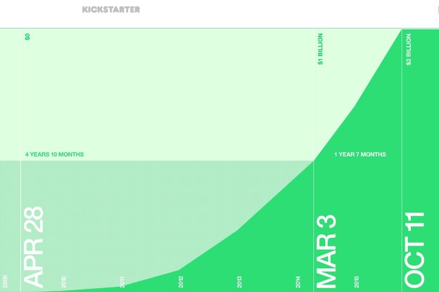 Kickstarter je objavio kako je za nekih 5 godina postojanja, njegov crowdfunding sustav omogućio prikupljanje novca za razvoj projekata u ukupnoj visini od 2 milijarde dolara, a taj novac je nositeljima kampanja uplatilo oko 9,5 milijuna ljudi, koji su vjerovali u nove proizvode, kulturne i umjetničke projekte, gadgete, tehnologije i ideje inovatora kojima je nedostajalo novca za komercijalizaciju.