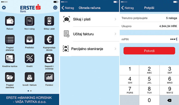 mBanking za poduzetnike omogućuje potpisivanje naloga i datoteka. Naloge za plaćanje koje je primjerice zadao vaš računovođa možete potpisati i autorizirati preko mobilne aplikacije gdje god se nalazili. Isto tako, aplikacija sadrži popularnu uslugu slikaj i plati koju je Erste prvi lansirao među mobilne aplikacije.