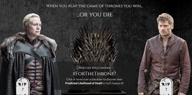 Kako se čini, loše se piše Bronnu, Gregoru Cleganeu (The Mountain), Sansi Stark, Branu Starku i Sandoru Cleganeu (The Hound), dok umjetna inteligencija iz podataka više od 2000 likova, informacija iz Game of Thrones Wiki i Wiki of Fire and Ice, daje samo 1% mogućnosti za stradanje mamici zmajeva Daenerys Targaryen, a vrlo vjerojatno je da će također preživjeti Tyrion Lannister, Varys, Samwell Tarly i Jaimie Lannister, dok Jon Snow ima 12 posto šanse da ga autori serije zatuku prema uputama Georgea R.R. Martina. To je čak više od zločeste Cersei Lannister kojoj je dao samo 5% šanse za odlazak na drugi svijet. Arya Stark koja je u posljednje dvije sezone postala jako omiljeni lik među fanovima, ima vjerojatnost od 47% da neće živjeti dugo i sretno.