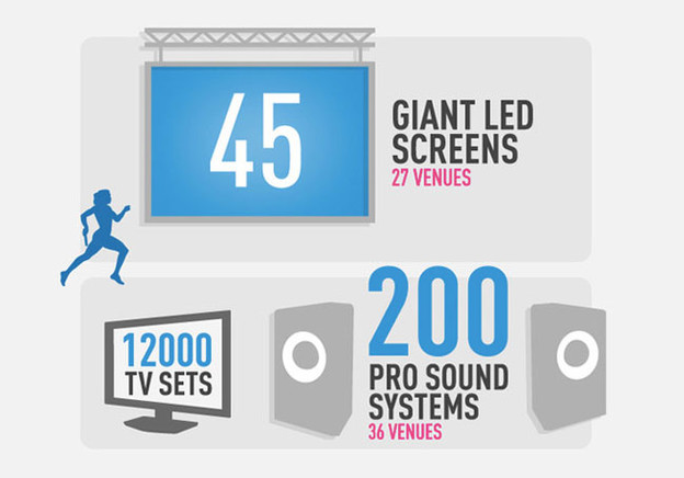 Tako je navedeno da će na Olimpijadi biti postavljeno 12.000 televizora, koji će pokriti prostor od 1.730 kvadratnih metara, što je više od Olimpijade u Pekingu prije 4 godine, na kojoj se našlo 10.000 televizora u prostoru od 1.312 kvadrata.