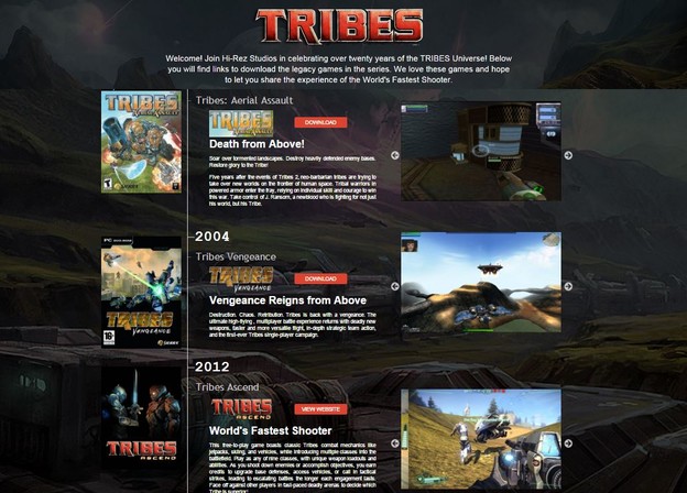 To znači da ćete putem poveznice izvora ove vijesti moći preuzeti igre Tribes Earthsiege (1994.), Tribes Earthsiege 2 (1996.), Starsiege Tribes (1998.), Tribes 2 (2001.), Tribes: Aerial Assault (2002.), Tribes Vengeance (2004.), kao i posljednju igru serijala, free-to-play naslov Tribes Ascend, koji je izdan 2012. godine.