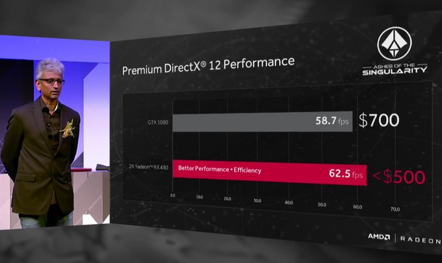 Tijekom prezentacije je prikazan i benchmark rezultat iz igre Ashes of Singularity, pri čemu je napravljana usporedba između konfiguracije s dva Radeona RX 480 koji zajedno koštaju 500 dolara s jednom GTX 1080 grafičkom koja se prodaje za 700 dolara. Raja Koduri je pokazao da su dva Radeona jača od znatno skuplje "entuzijast" grafičke kartice Nvidije, no "zaboravio" je reći koje su računalne konfiguracije korištene u testu, niti na kakvim je postavkama bila grafika.