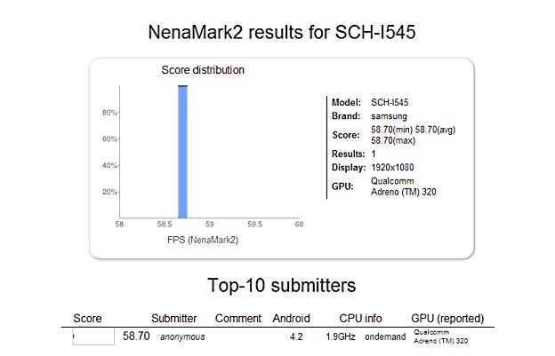 Ovaj screenshot gore prikazuje rezultate NenaMark2 benchmarka koji je izveden na Samsungovom uređaju SCH-I545.
