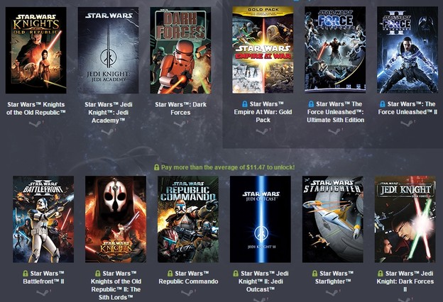 Uglavnom, za navedeni iznos dobit ćete ove igre: Star Wars Knights of the Old Republic, Star Wars Jedi Knight: Jedi Academy, Star Wars: Dark Forces, Star Wars Republic Commando, Star Wars Knights of the Old Republic II: The Sith Lords, Star Wars Battlefront II, Star Wars Starfighter, Star Wars Jedi Knight: Dark Forces II, Star Wars Jedi Knight II: Jedi Outcast, Star Wars: The Force Unleashed II, Star Wars The Force Unleashed: Ultimate Sith Edition i Star Wars Empire at War: Gold Pack.