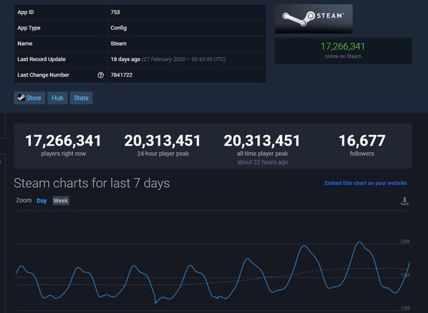 Steam je ovaj vikend srušio apsolutni rekord po broju igrača koji su se istovremeno spojili na platformu. Prema podacima Steama u jednom trenutku na platformi se nalazio 20.313.451 igrač, što je prvi puta da se odjednom okupi više od 20 milijuna igrača, a od te brojke njih gotovo 6,4 milijuna je aktivno igralo igre.