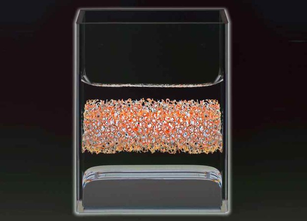 Fizički model baterije od tekućeg metala na sobnoj temperaturi u staklenom spremniku. Photo Credit: Felice Frankel