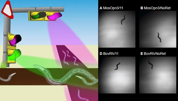 U ovom slučaju, tim ih je koristio za izravnu kontrolu kretanja C. elegansa, sićušnog crva koji se obično koristi u laboratorijskim studijama. U te su crve ugrađena dva opsina, jedan, koji potječe od komaraca, stavljen je u osjetne stanice koje uzrokuju da se stvorenja izmigolje od podražaja, što bi ovdje bila svjetlost. Drugi opsin, dobiven iz ribe paklare (zmijuljice), osjetljiv je na UV svjetlo i ugrađen je u motoričke neurone crva.