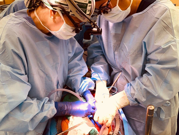 Dr. Jayme Locke, lijevo, i Natalie Budd pripremaju abdomen čovjeka za presađivanje svinjskog bubrega. Photo Credit: Jeff Myers/UAB