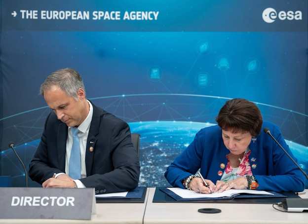 ESA-in direktor za ljudska i robotska istraživanja Daniel Neuenschwander i NASA-in pomoćna administratorica za znanstvene misije Nicola "Nicky" Fox potpisuju sporazum o misiji Rosalind Franklin u ESA-inom sjedištu u Parizu, Francuska, 16. svibnja 2024.