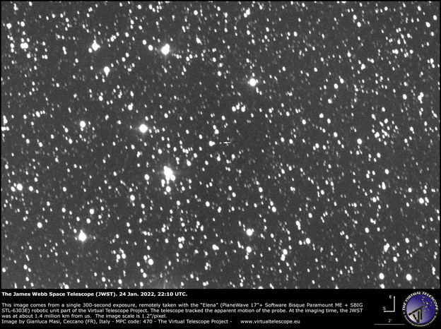 Slika dolazi od astronomskog programa Virtual Telescope Project 2.0, koji omogućuje promatranja svemira u realnom vremenu s daljinski upravljanim teleskopima. Snimka napravljena ekspozicijom od 300 sekundi prikazuje JWST na točki L2 koju je snimio talijanski teleskop Elena, smješten u blizini Rima.