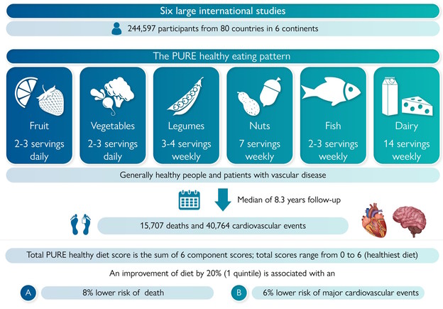 Konzumacija voća, povrća, mahunarki, orašastih plodova, ribe i punomasnih mliječnih proizvoda ključna je za smanjenje rizika od kardiovaskularnih bolesti, uključujući srčani i moždani udar. Studija je također otkrila da se zdrava prehrana može postići na različite načine, poput uključivanja umjerenih količina cjelovitih žitarica ili neprerađenog mesa.